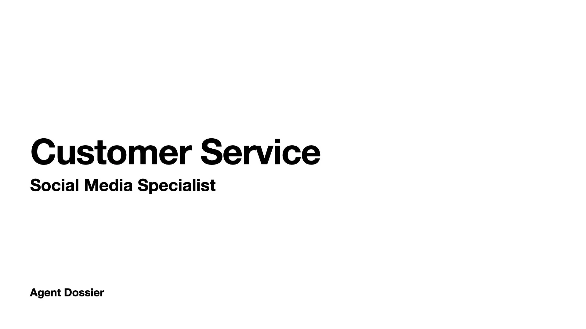 Cover page of a customer service agent dossier for a social media specialist, with the title in large bold text and the subtitle beneath it.