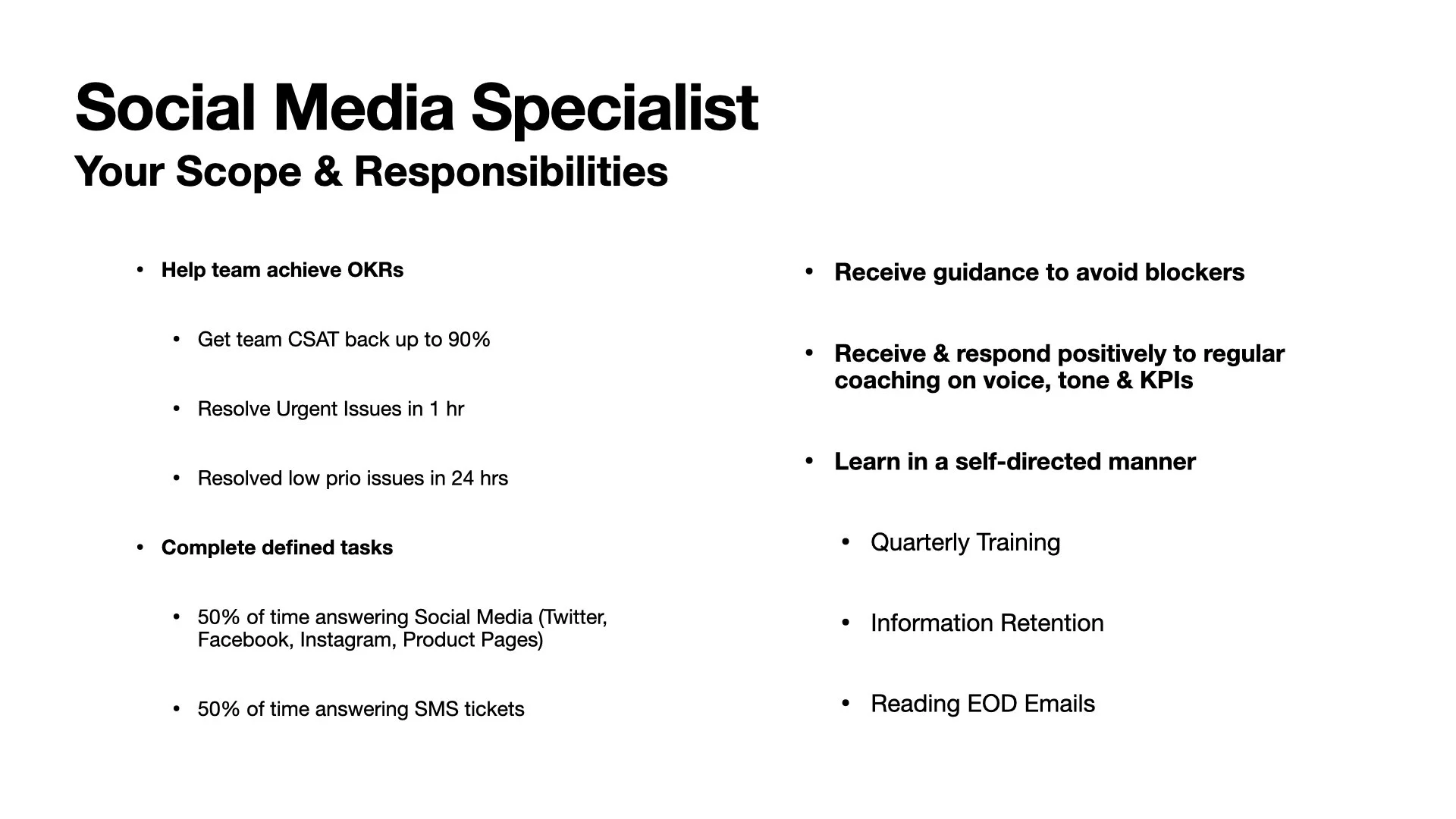 A presentation slide titled 'Social Media Specialist: Your Scope & Responsibilities' listing various tasks and responsibilities divided into two columns.