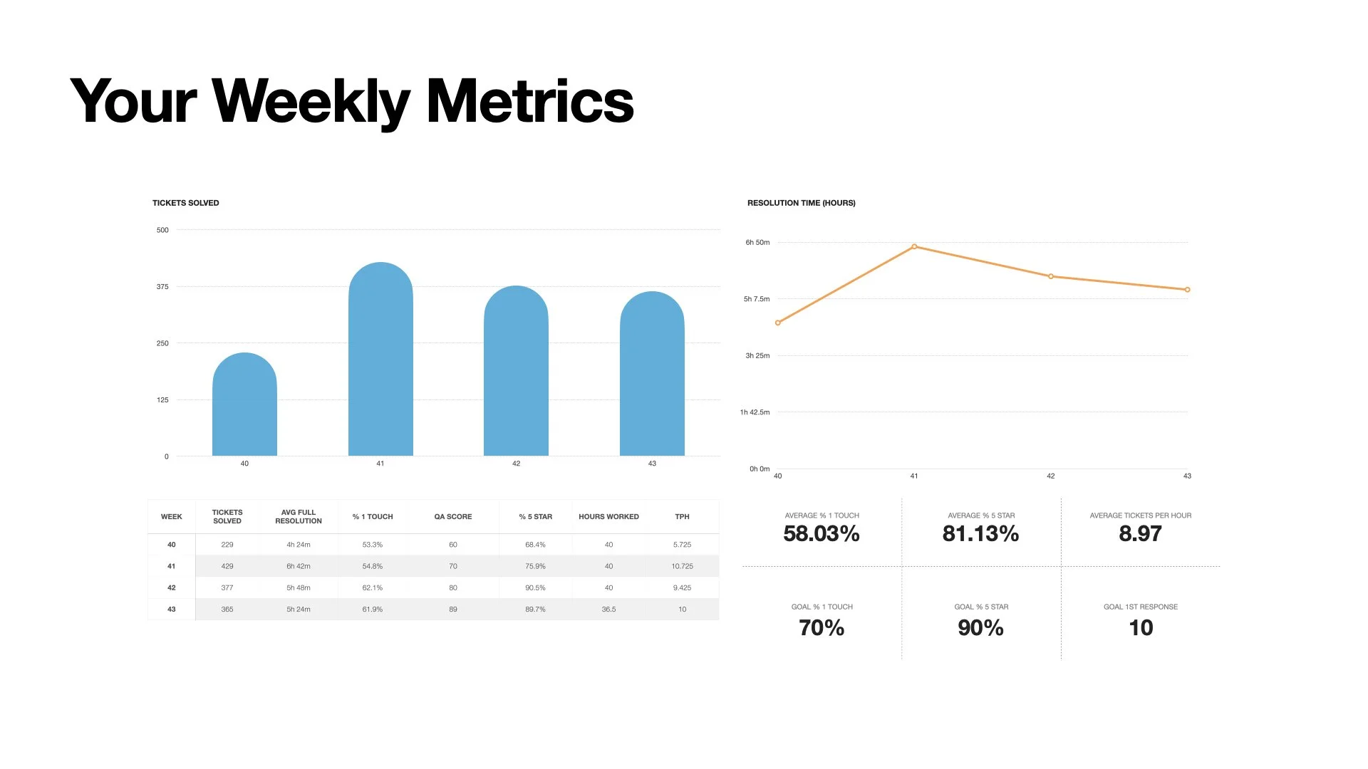 Dashboard titled 'Your Weekly Metrics' displaying bar and line charts with data on tickets solved and resolution time, respectively, along with summary statistics and goals for weekly performance.