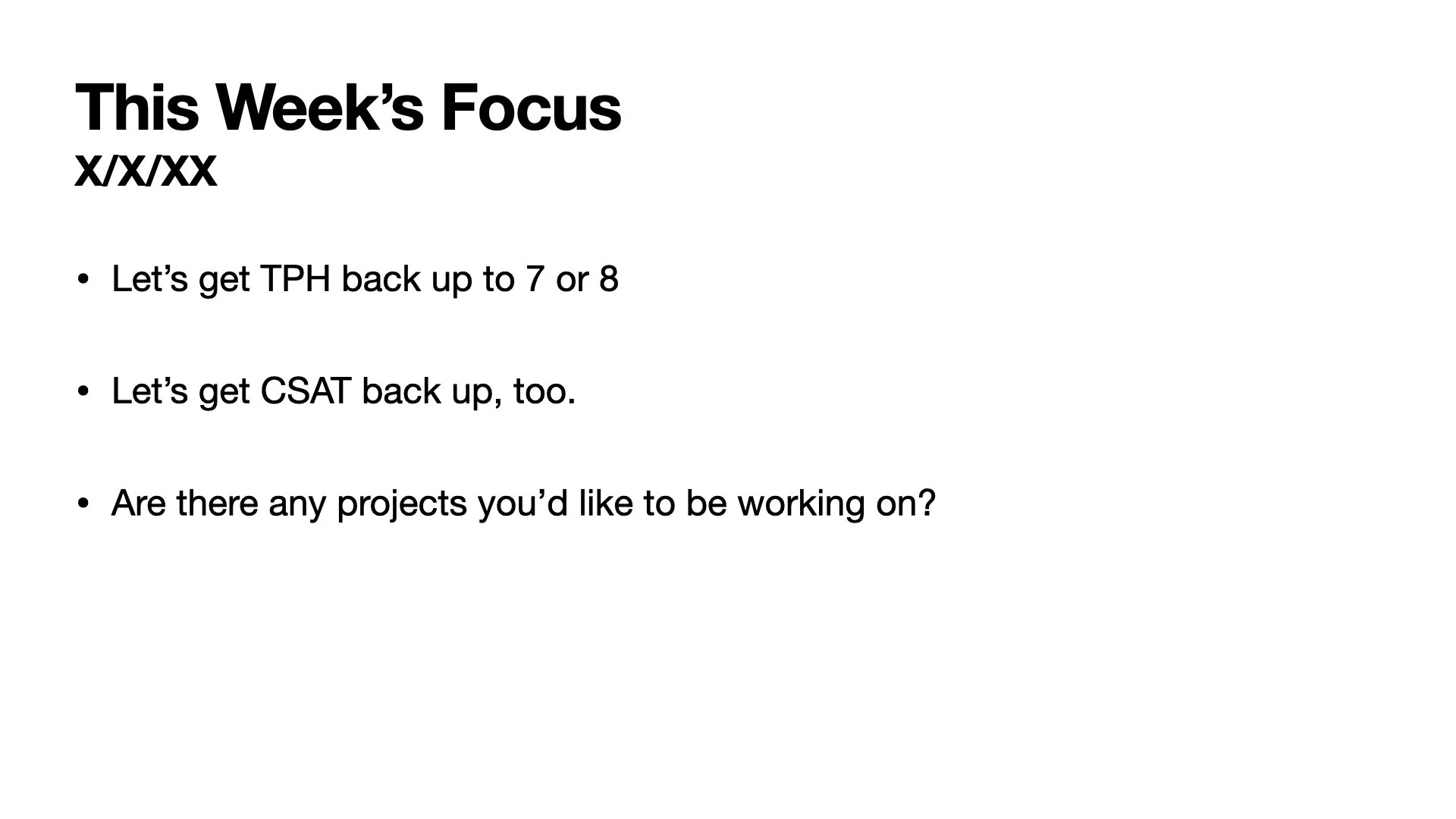 Slide titled 'This Week's Focus' with a weekly plan including goals for improving TPH and CSAT, and inquiring about projects.
